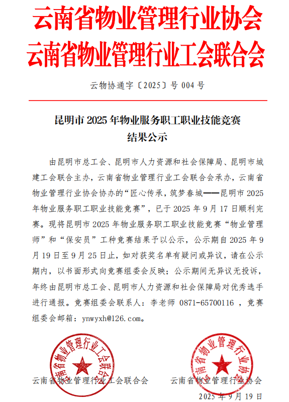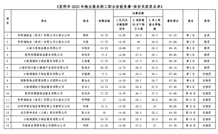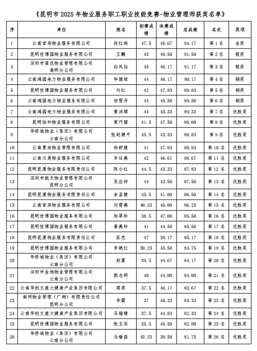 昆明市2025年物业服务职工职业技能竞赛结果公示