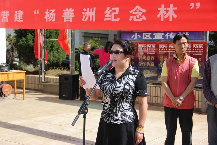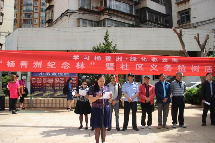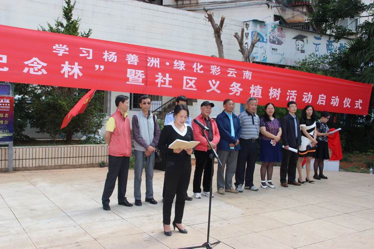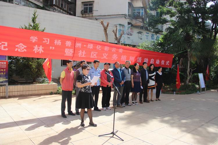 杨善洲同志是我们党的优秀儿女,更是我们云南人民的骄傲。从小,我们被一代代的英雄模范、先进典型人物感动着、激励着。杨善洲同志的先进事迹和他胸怀大爱、赤诚一生的事迹也在打动着我们。杨善洲同志“忠”、“诚”、“勤”、“检”、“信”的优秀品格,体现了一个优秀共产党员始终如一的高尚情操。今天,6月2日,《学习杨善洲•绿化彩云南,营建“杨善洲纪念林”暨社区义务植树活动启动仪式》在颐园里举行,为的是践行党的宗旨,永葆共产党员的政治本色,为推动社区又好又快发展提供强大的精神动力。