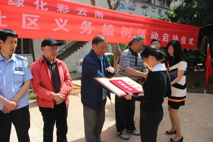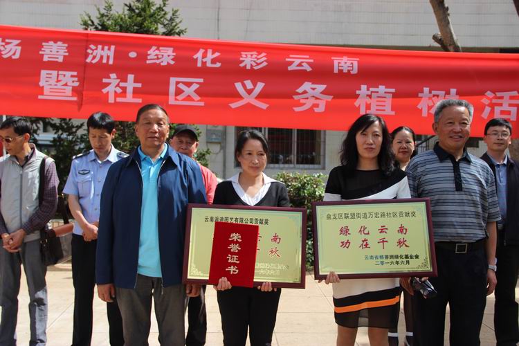 云南省杨善洲绿化基金会理事长李森、副理事长王德祥为爱心企业单位云南逅迪园艺有限公司、此次活动的爱心承办单位盘龙区联盟街道万宏路社区颁发纪念奖牌;
