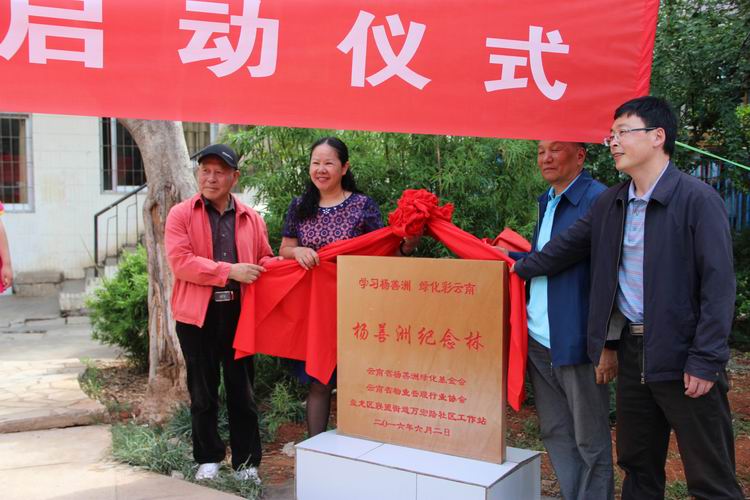 基金会理事长李森、副理事长王国亮、盘龙区领导、省物业管理行业协会领导为“杨善洲纪念林”纪念碑揭幕。