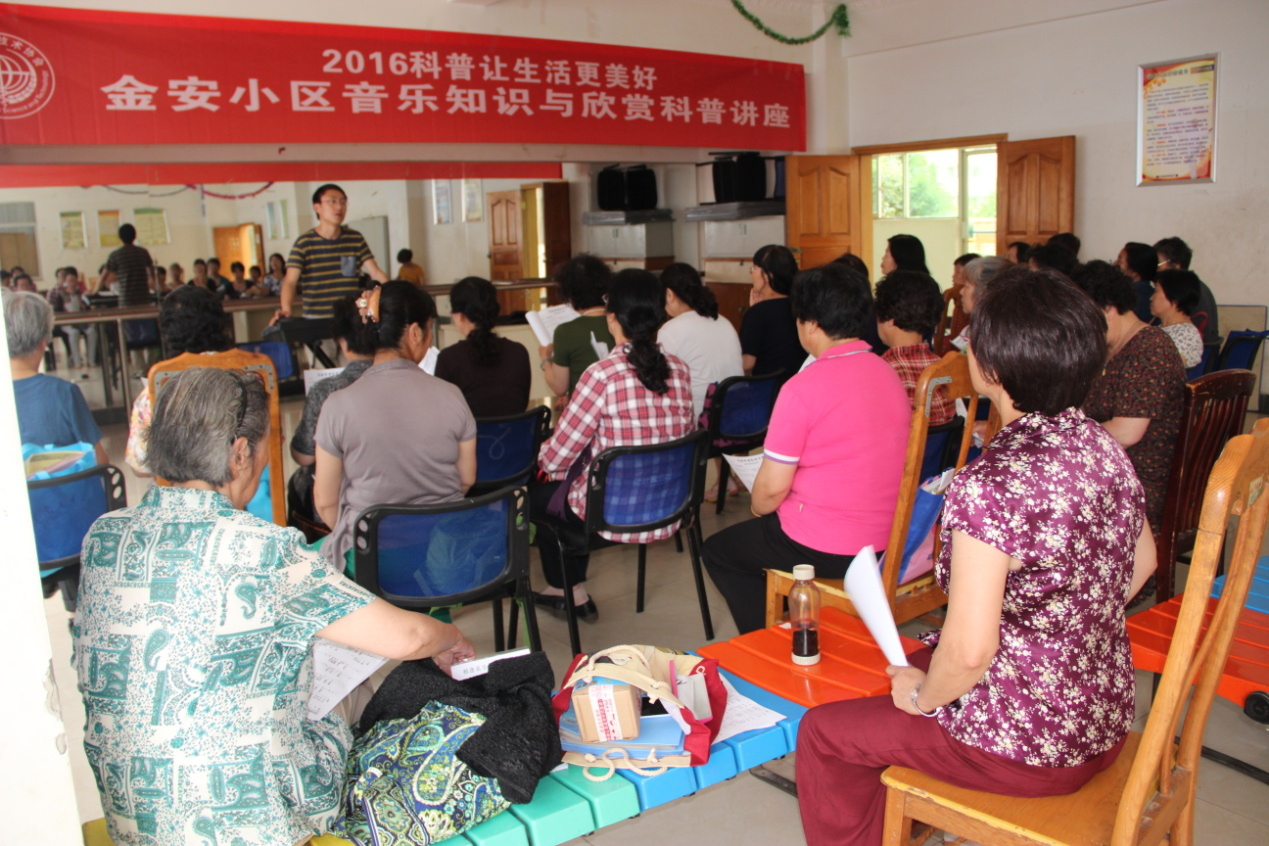 金安小区音乐知识与赏析科普知识讲座 为了丰富老年人的老年文化生活,满足老年人老有所乐、老有所学的需求。针对别特的群体开展不同的科普知识讲座。2016-6-16,科普让生活更美好