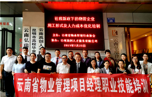 云南省物业管理行业协会于2019年7月25日举办“《云南省物业服务导则(试行)》贯彻宣讲及社税新政下的物管企业用工形式及人力成本优化”培训。来自全省各地区多家物管企业人力资源部门主管人员参与了本次培训,协会会长宋有兴、副会长周虎、常务副秘书长成忻、理事何谦,协办单位云南高创人才服务有限公司董事长王飞、副总经理张洪、事业部总经理高畅、法律顾问陈先波出席了本次活动。